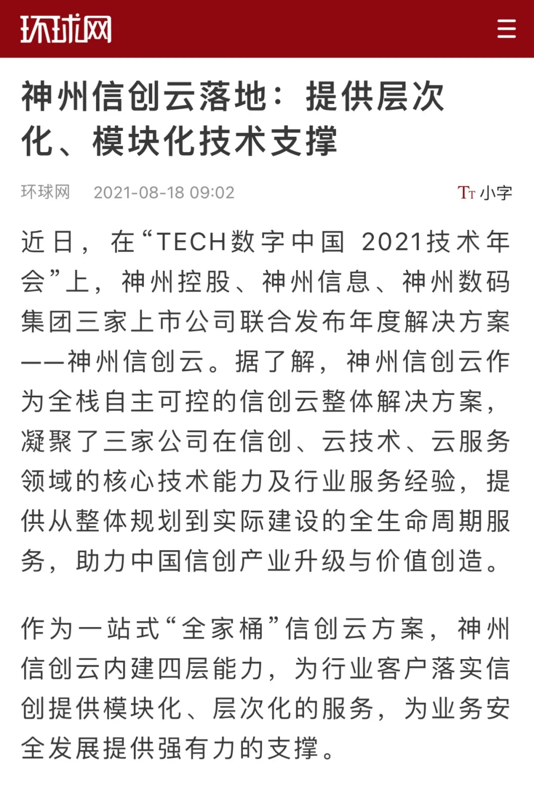 “数字中国 2021技术年会”云上举行 神州控股等联合发布 “神州信创云”